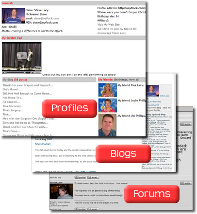 Everytime a member or guest visits your site, they'll see that your site is current and active. Most of all, they'll see that other members of your church are there too. Add some tools like a personal profile, a personal blog, a forum, and the ability to interact with other members and you've got discipleship and fellowship that lasts all week long. It's all on the private side of your site.